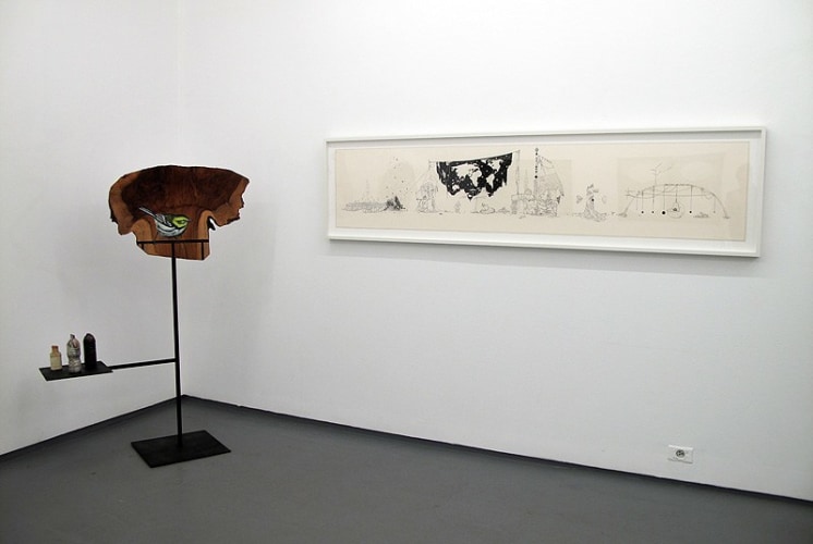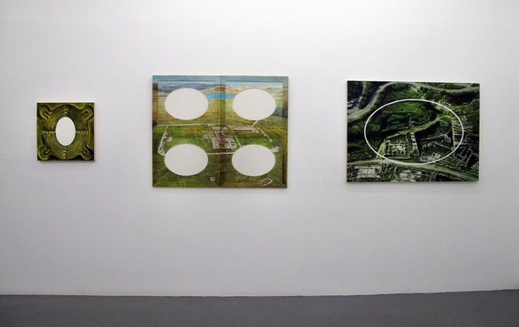 Donna Moylan makes psychologically charged, metaphysical paintings rich with abstract elements; Jason Middlebrook uses natural forms as a ground for his painterly explorations of geometric abstraction; Anthony Goicolea pushes painting and drawing into romantic, architectural realms in his magical, double-sided works on Mylar mounted on boards; and Ellen Harvey investigates history and geography in her aerial views of ruins married with abstract forms.