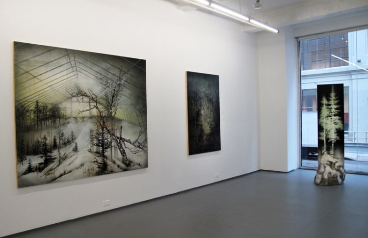 A visit to Donna Moylan’s magnificently restored 1820s’ residence in Kinderhook, NY and an awe-inspired viewing of Rob Marshall’s 2014 musical film Into the Woods, reminded the curator of how marvelously the compositions of Stephen Sondheim addresses contemporary times and brought his thoughts back to Sondheim’s whimsical tune “A Weekend in the Country,” which plays particularly well with the ironic engagement of nature in these seven artists’ works.