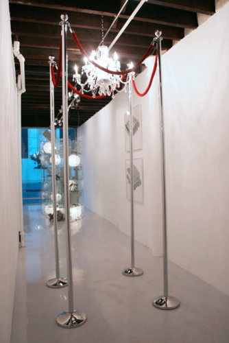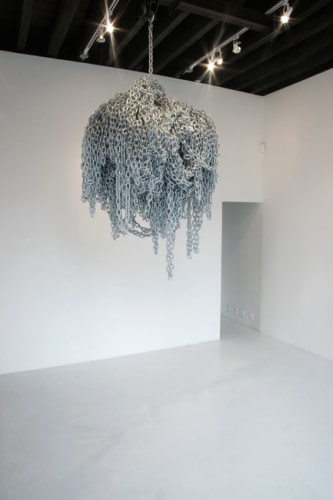 In Magnan Emrich Contemporary, Almanza creates Out to Lunch (Closed for the day). Addressing ideas of safety measures and codes, the artist wraps and ties chain links into knots creating a huge ball suspended from the ceiling rafters of the gallery. Its’ own weight pushes the chain to its established load limit. Visitors entering the space are confronted with the threatening structure. Will it break from its own weight? Do we trust the safety codes that are imposed on us? Or, does one assume that in a gallery setting it must be safe to walk under or around? Perceptions of danger become individual experiences.