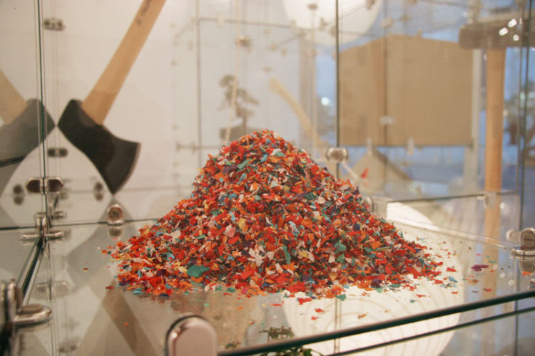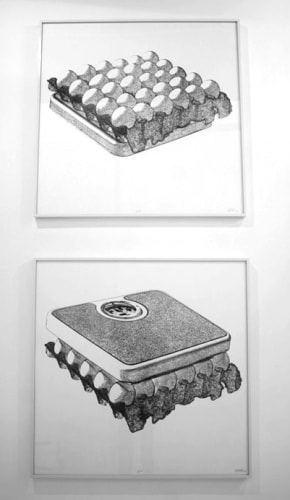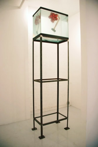 For Magnan Projects, the artist stacked glass cubes atop one another in presentation-like cases RPS (you might kick my ass but that feeble adversary behind you will kick yours). The materials seem an uncharacteristically pristine choice in their fragility and strength, value and purpose. Each case displays one of three objects representing Rock, Paper and Scissors - a humorous twist on the child's game. Although “static” they are concerned with the fragile nature of placing objects in glass encasements in potentially precarious situations. Conversely, the installation is “…almost like a still life, something captured in time. People attend to shows where there is danger involved, like the circus or the bullfights. I think the spectator deeply wants to see an accident.”
