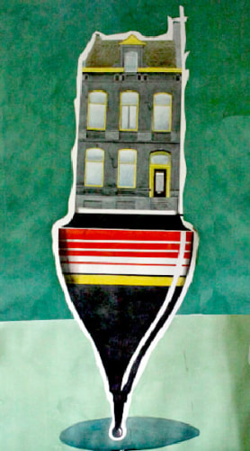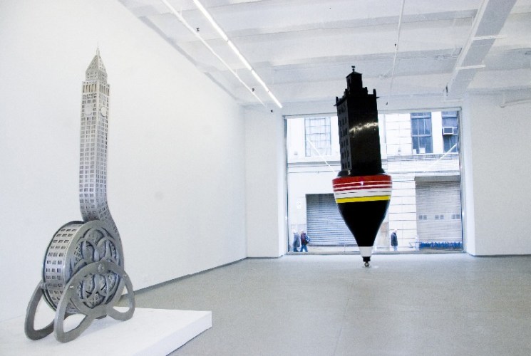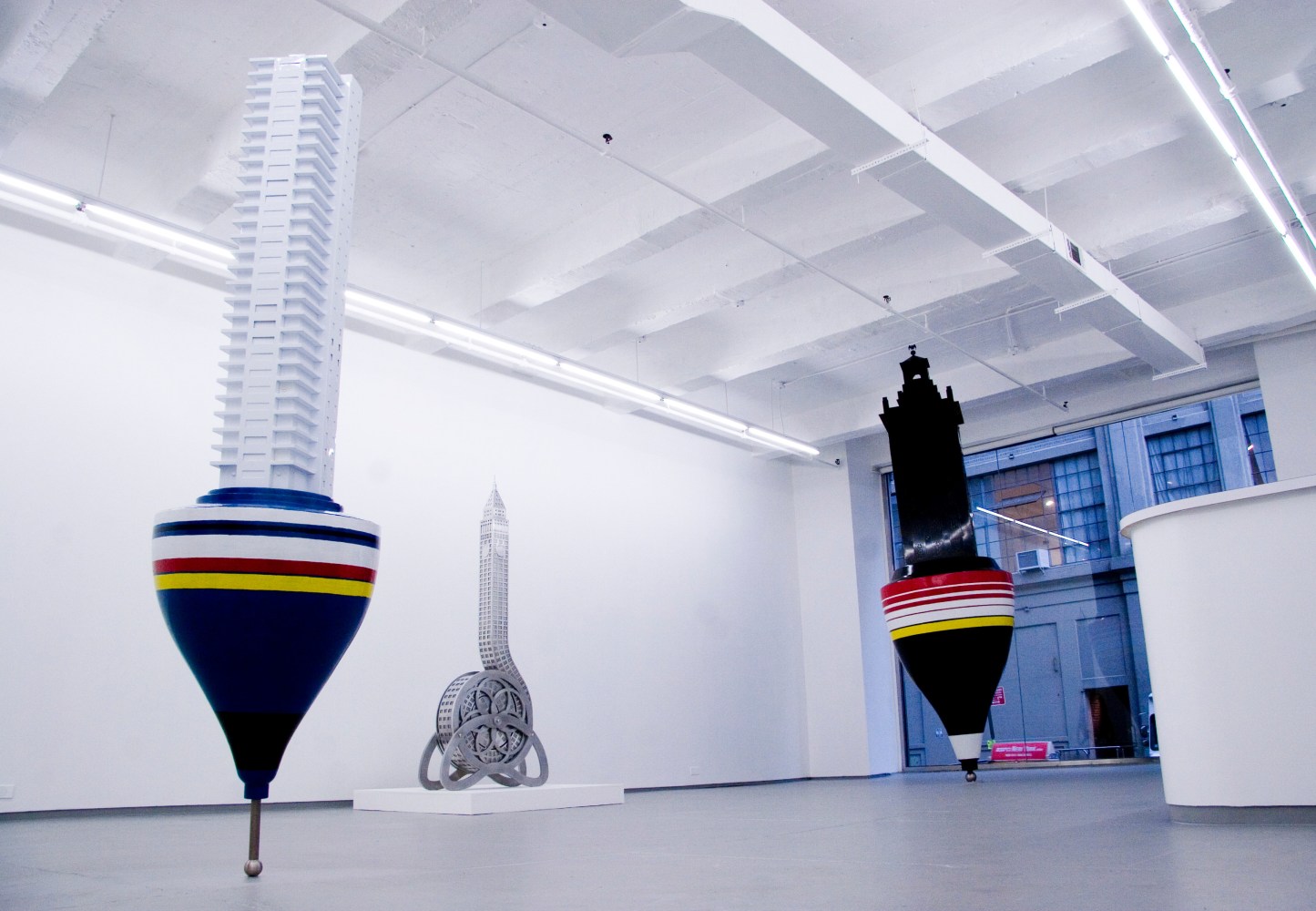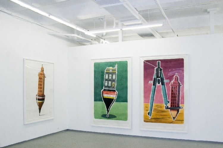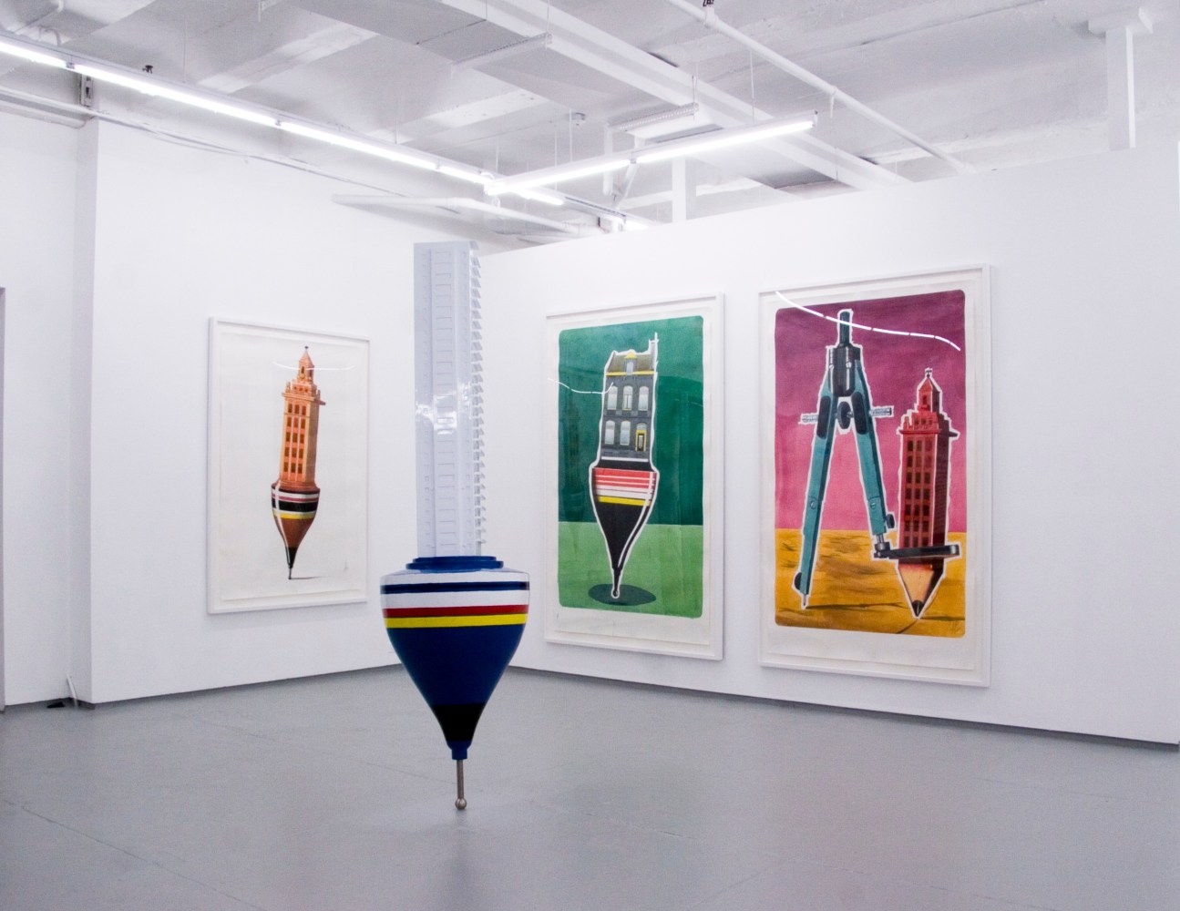 Elasticity introduces a new perspective for the artist. Where his previous work explored issues of failure, uncertainty and suspicion, Arrechea now defies those finite senses and creates expressions of continuous movement. Inspired by architectural buildings from his native Cuba, as well as landmark buildings in the U.S., Arrechea began to fuse these familiar structures to the body of a spinning top. The result is a “dancing” city or building in perpetual motion. Elasticity includes two (2) large scale sculptural tops, including the Bacardi Building in Havana that stands approximately 13 feet high. There will also be watercolor drawings of real and imagined buildings.