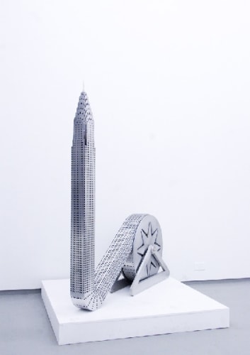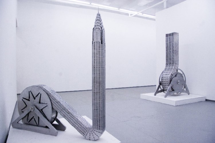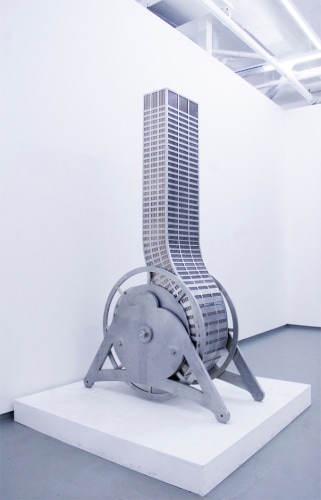 Taking the adaptation of architecture and movement a step further, Arrechea created a series of rolled-up sky scrapers – as if one could reel these rigid structures in like a hose–transforming monumental buildings into a tool or snail-like shape. Arrechea views this as a direct act of irreverence to the understanding of what verticality in a building means. He has physically reshaped the concept of verticality and monumentality into a new reality: elastic architecture, or city. This concept can also be interpreted as a metaphor to the challenges of adapting to new realities we face every day. Arrechea describes his work as having, “created a sculpture which is a metaphor of the constant changing forms in the evolution of our minds.”
