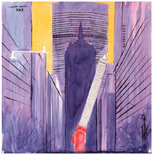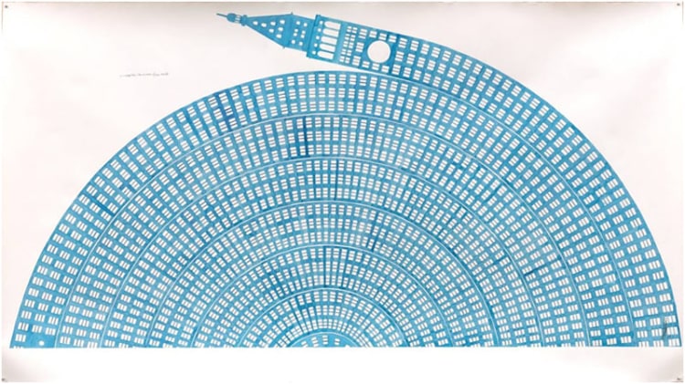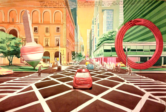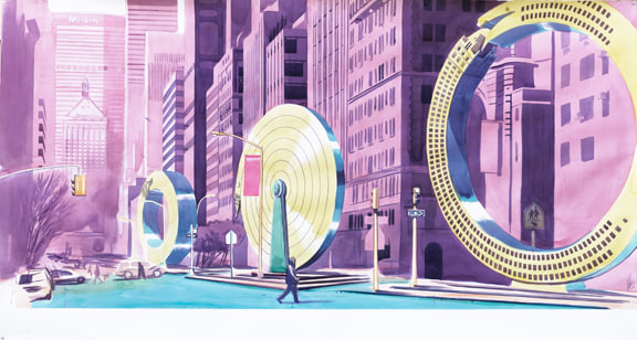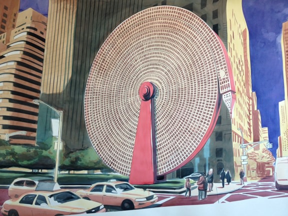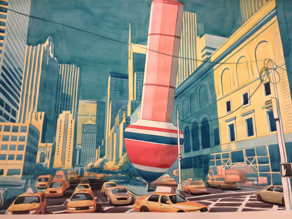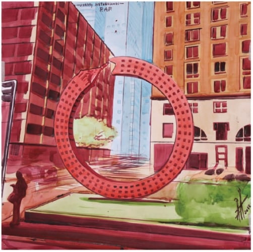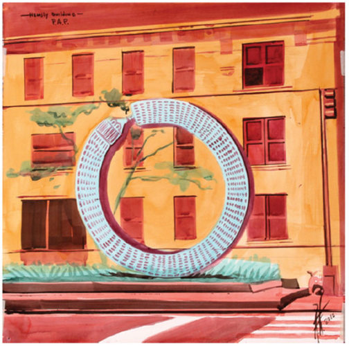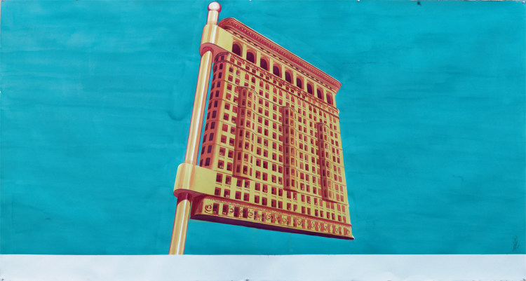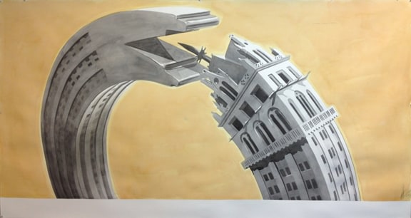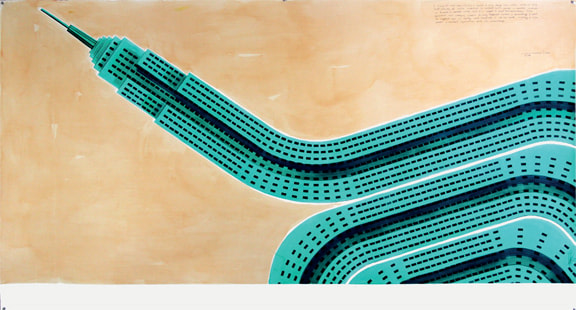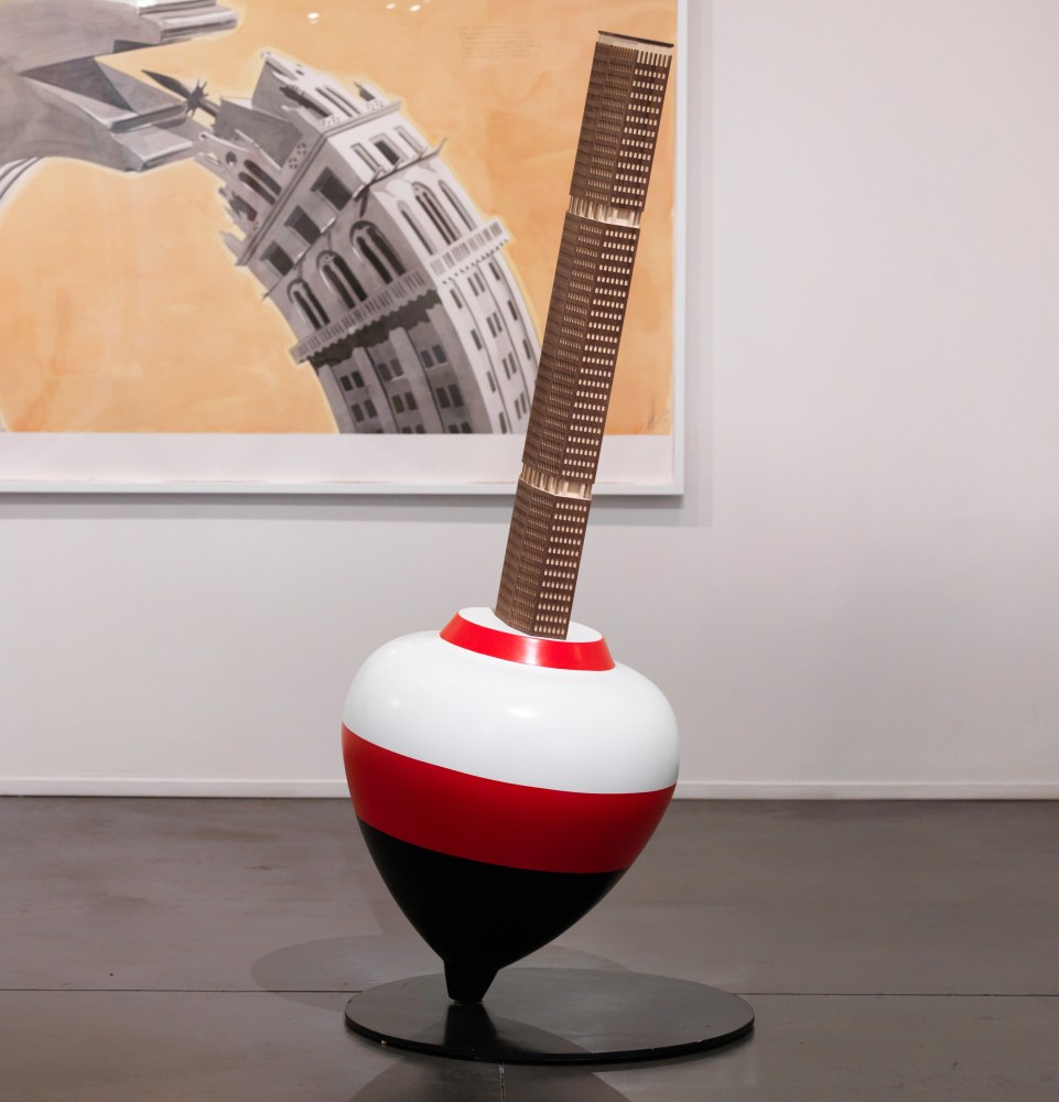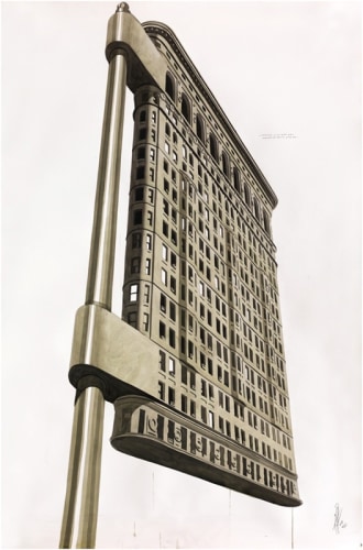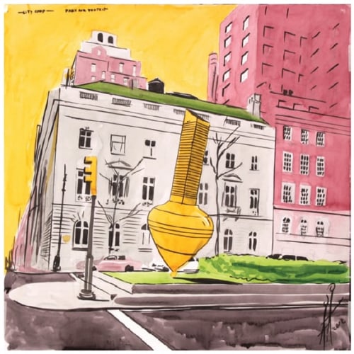 In the Park Avenue series, Arrechea also fuses the familiar structure of architectural landmarks to the bodies of spinning tops, or trompos (toy tops popular in Latin America) as another form of elasticity. The result is a "dancing city" or building in perpetual motion that can continuously spin, wind down, fall, or rise again.