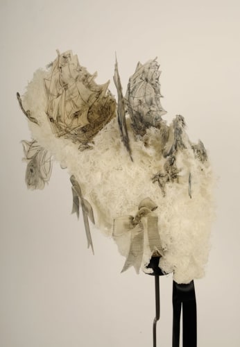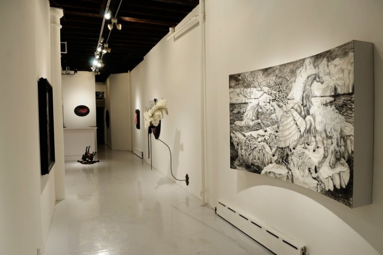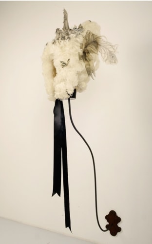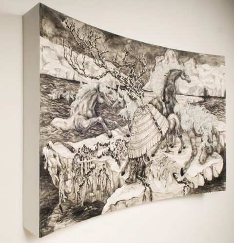 Employing a wide range of materials, the artist creates sensual surfaces and textures. Drawing on upholstered velvet, brush-drawn and carved lines on vellum and molded leather surfaces, Biewald achieves varying levels of translucency, further exploring her interest in notions of supernaturalness. She explains, “What interests me are the inherent visual possibilities of [that] supernaturalness; where the line between what is artificial and what is natural with regards to our physicality becomes blurred. I create crypto-zoological ‘scapes’ involving painterly drawing on vellum, leather, and upholstered velvets, inhabited by these unique complex characters. These characters, these crypto-equestrian and crypto-vegetal hybrid beings, are portrayed as desirable and alluring, yet dangerous. I imagine and create universes or ‘landscapes’ for these beings to inhabit.”
