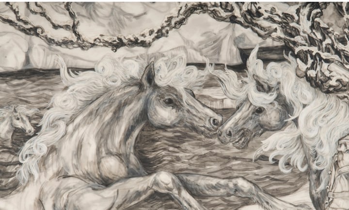 In her latest works Biewald harnesses her interest in great legends and mingles fact with fiction to recreate fables or intrigues. Her frenzied world of hybrid beings are captured in a state of transformation and unions from one animal or being to another, forever becoming a tree, or a woman or a horse – seeking the pinnacle of supernatural beauty.