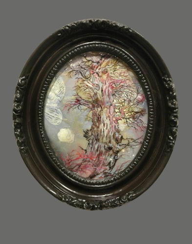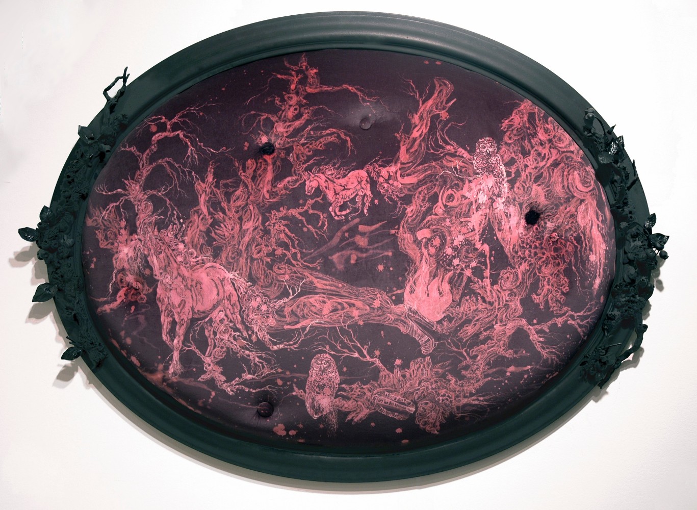 Heavily influenced by the landscapes and dark dwellings of Romanticism, the artist has built a grotto-like arch in the entry of The Gallery allowing Biewald to reconstruct the space and create an air of timelessness. Works on paper, bleach painting on black velvet, upholstered materials, resin and clay are some of tools used to transform the animal/human form. Her combination of media incorporates a sense of wit and even a nod to kitsch; the bleach paintings on black velvet – a classic in kitsch art – are beautiful, skillfully rendered landscapes riddled with hybrid forms. A woman’s leg adorned in knee-high, laced boots reaches out of a tree trunk and morphs into another supernatural form flowing seamlessly into the illusion. Biewald’s ornate frames are hand-made to perfection, recalling earlier centuries. To the artist, the incorporation of upholstery techniques, such as tufting, alludes to the body and living structures. “I am very drawn to the physical connection between attraction and the alluring and repulsion as response to surface in sculpture… There’s a sensual moment; you want to touch it; but there’s no return. I want to bring people into the surface, but when they inspect it, there’s a duality, a dream-like quality, a dark humor.”