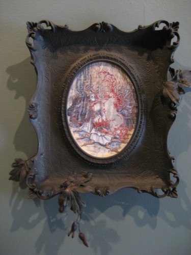 Biewald researched the use of the beautiful woman as the “subject” in fine art and her shifting credibility over time. 20th Century Modernists painted women out of their art, while the 21st century is re-embracing beauty once again. In Wicked Sister, Biewald explores this iconic image through the use of hybrid beings (mostly animal/human combinations), “portrayed as desirable, beautiful and alluring subjects resplendent with feminine charm… Today, the corseted and bound body of the past has been internalized making the illusion seem all the more real,” she explains.