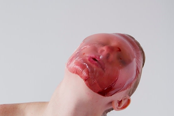 Russell’s recent work continues to explore the possibilities of flesh, using her skin as both source material and an entry to go deeper into the body and its emotions. Images of Russell’s abdomen appear throughout the exhibit: covering the gallery window; in a photograph of her torso blanketed in triangular welts resembling raised sails; and as the temporary tattoo mask that she manipulates over her face in the video, Blouse. In this piece, she exhales sharply into the mask to produce a fleeting, gauzy window. A sudden inhale collapses the window to create a skin-tight barrier with each breath. Blouse comes to a close as Russell removes the tattoo, her unadorned face remaining interrogative but naked of the revelatory mask.