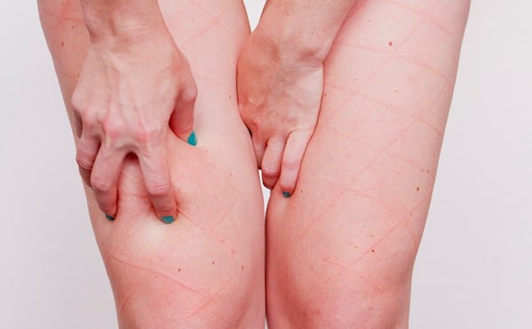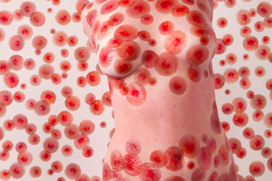 The skin is a porous surface, and challenges with it often have to do with personal boundaries. Russell has dermatographia, a condition in which her immune system exhibits hypersensitivity through the skin, causing painless, temporary welts that emerge when lightly scratched. The symptoms of dermatographia create a drama that plays on the skin, allowing Russell to address the aftermath of bodily contact—as evidenced by her video, Ruffle. She appears in three-quarter profile, opposite the viewer. A red, raised handprint gradually materializes on her exposed backside. The flesh offers evidence of a physical exchange, albeit unaccompanied by narrative or explanation. Her skin, while unable to disguise the inflicted mark, invokes the action that brought it to the surface.