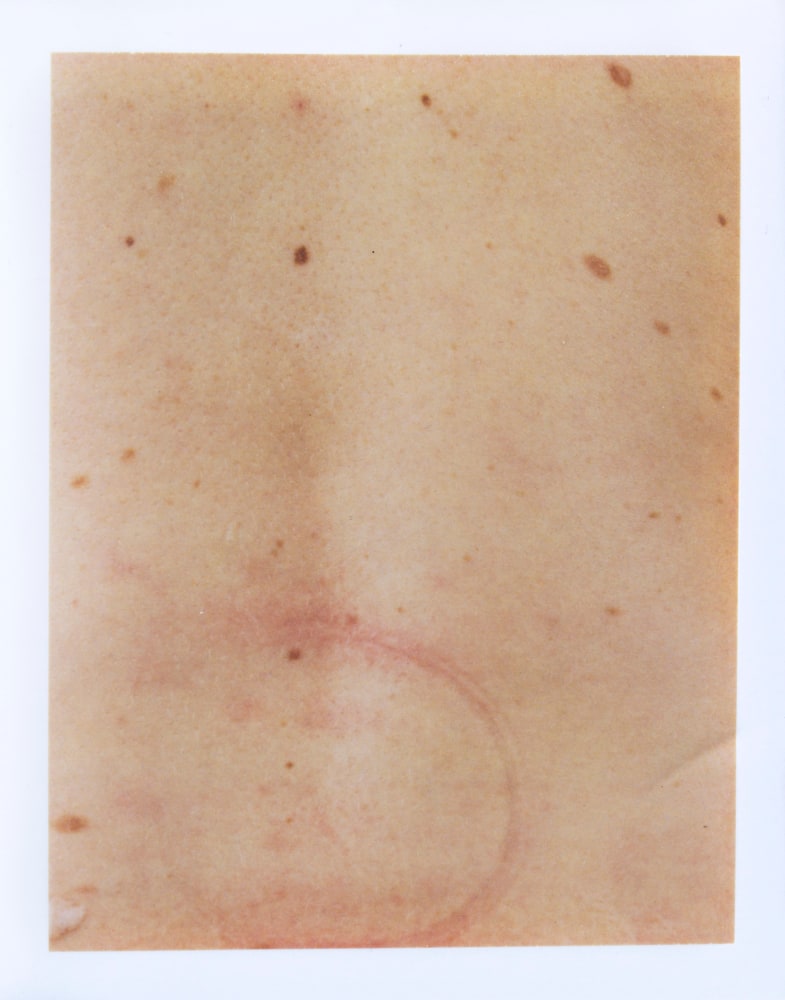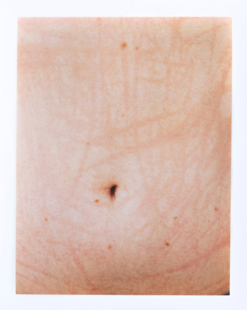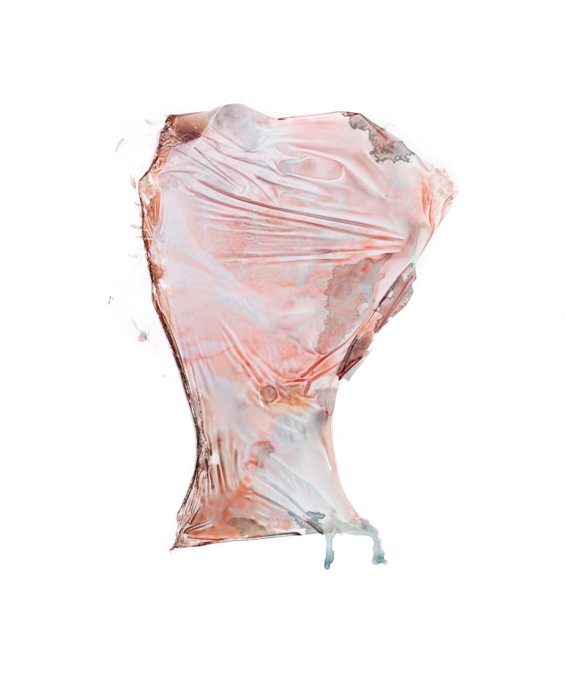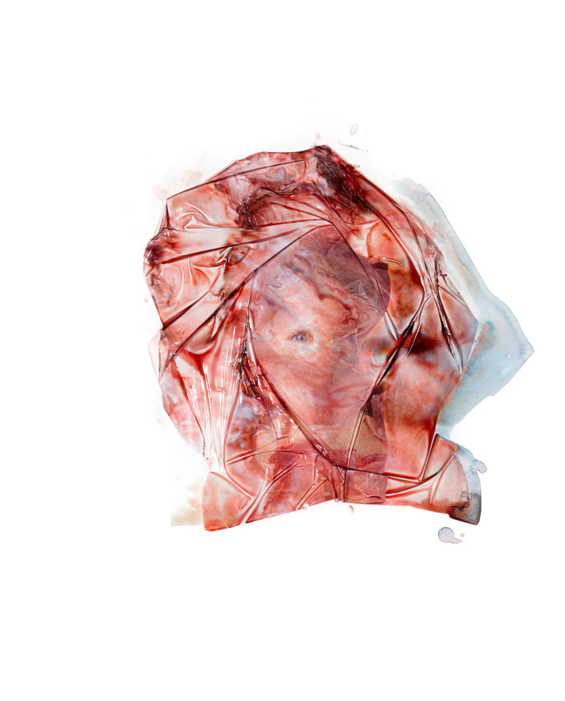 The walls are lined with Russell’s rose-toned likeness, many focusing on the distortion of the source image. No longer using the transparencies to adorn her body Pucker, Routes and Buoy are unique photographic transfers onto a paper surface, the work’s viscous surface creating a warped tension within the composition.
