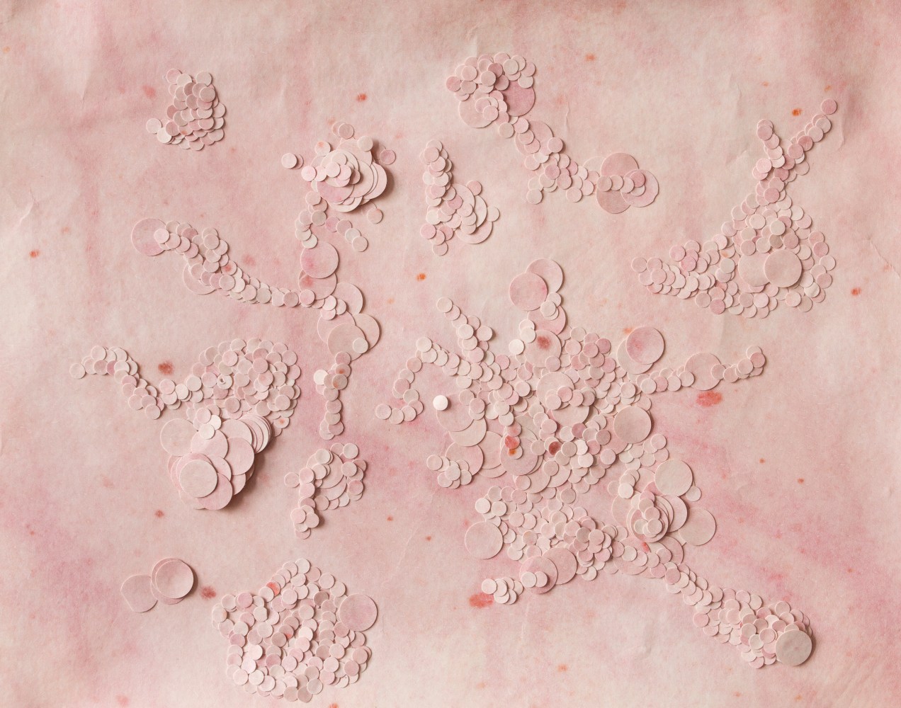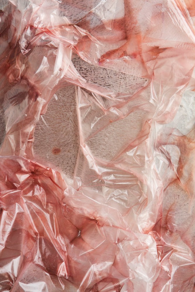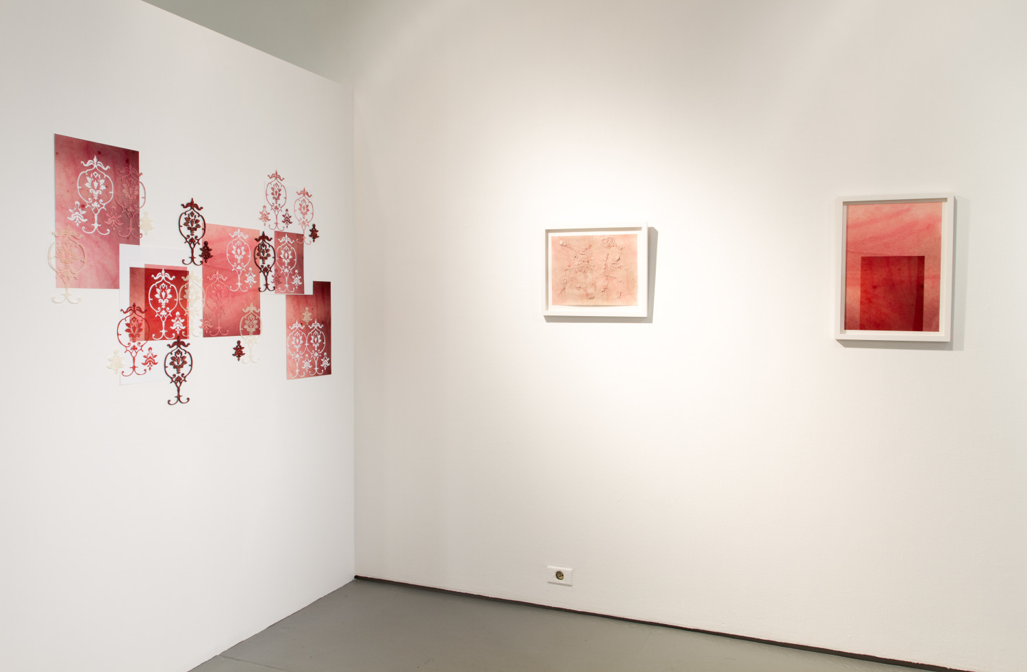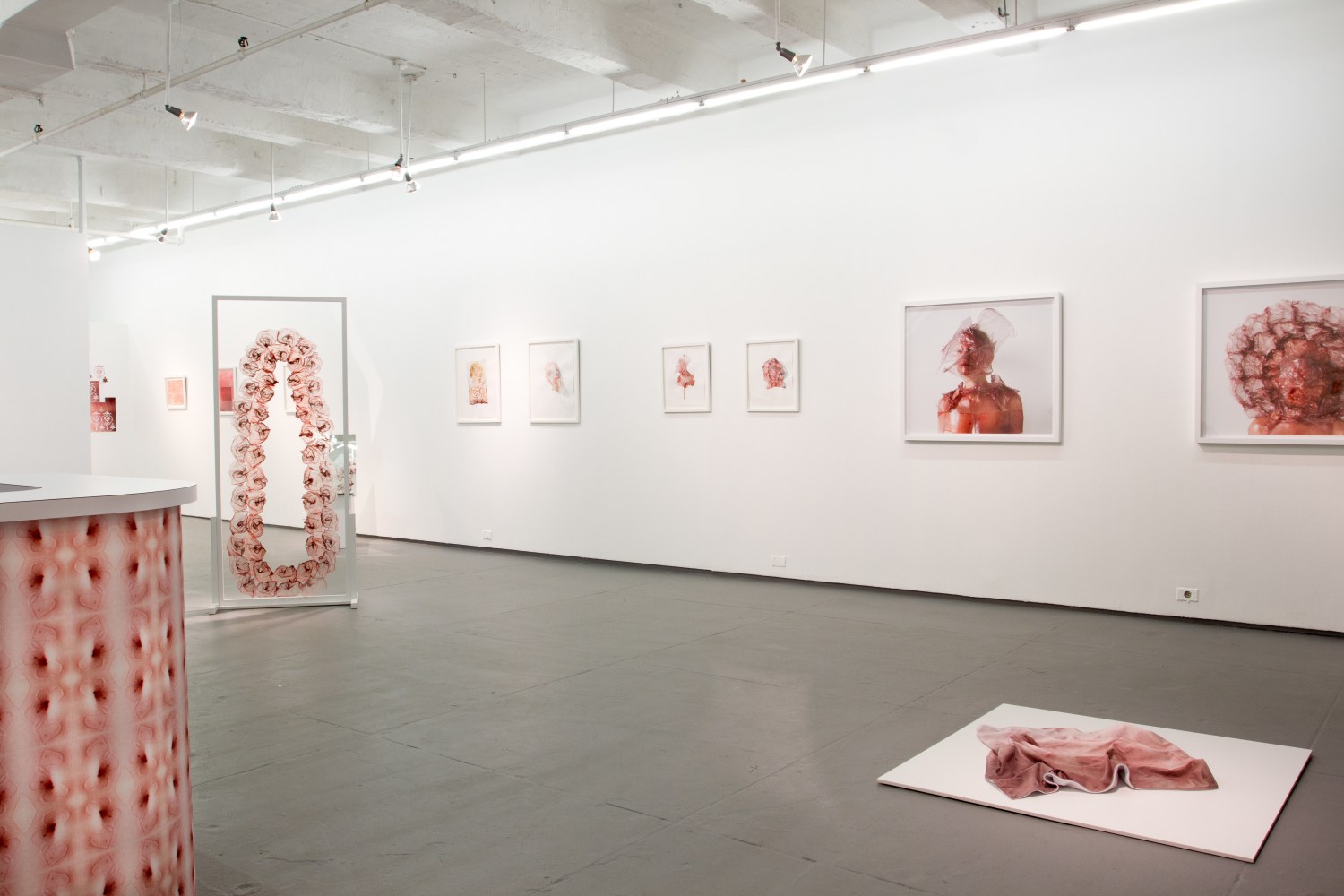 The walls are lined with Russell’s rose-toned likeness, many focusing on the distortion of the source image. No longer using the transparencies to adorn her body Pucker, Routes and Buoy are unique photographic transfers onto a paper surface, the work’s viscous surface creating a warped tension within the composition.