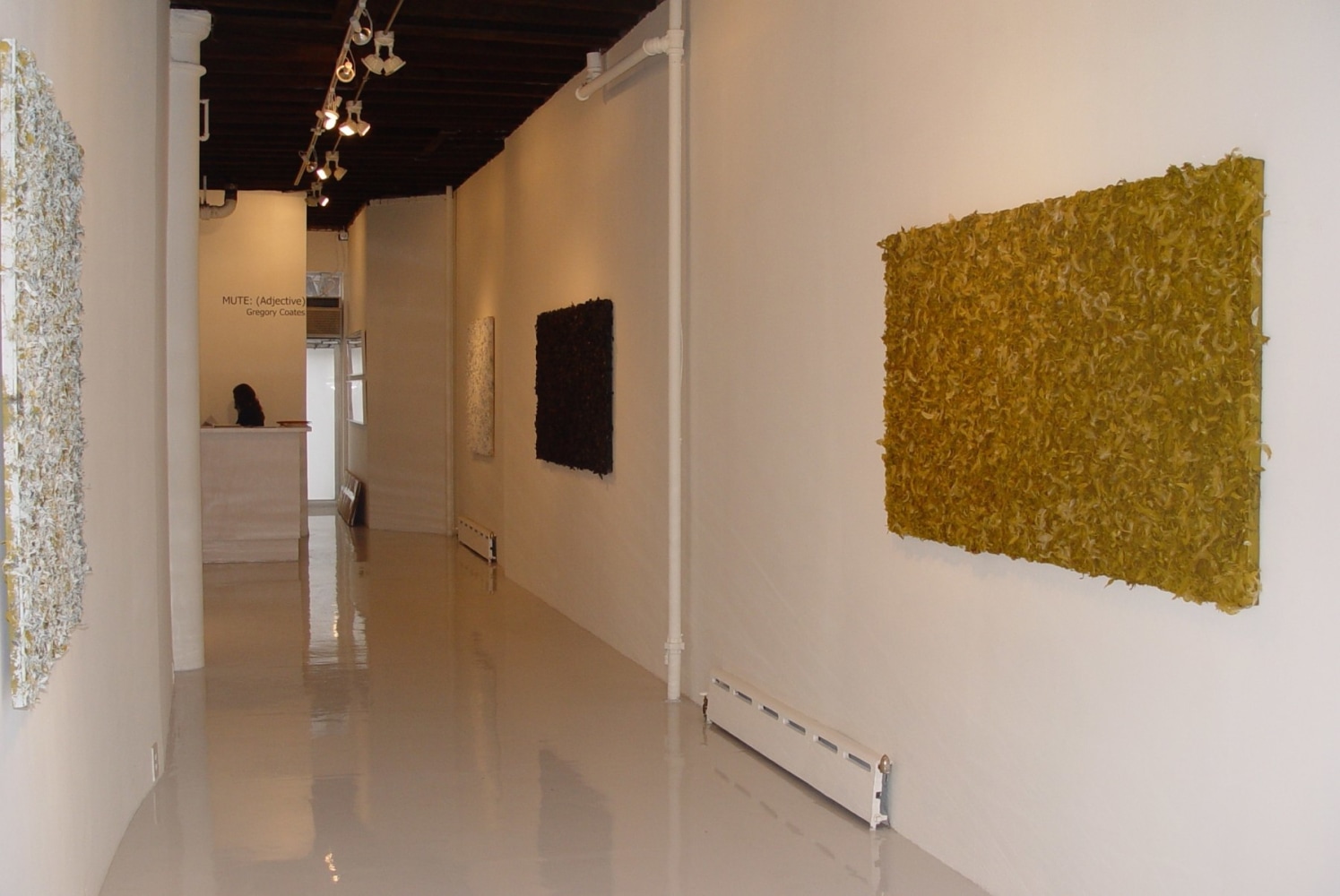 Mute presents Coates’ new work from the Feather Series reflecting a departure in approach and attitude in his art. These paintings are far more introspective for Coates. They are loaded with a multiplicity of undefined references both artistic and allegorical. They have an overall affect that align them with spiritual and ceremonial objects of nonwestern cultures. The spiritual aspect of these feathered works is partly due to their association with grief and eulogy given that Coates wants them to function as a memorial to loss. However, the feather works reject a direct topical reference to death and grieving, rather they become sites for sanctuary and contemplation. They are not meant to speak to finality, but metamorphosis. But while these works are partially requiem to loss, Coates doesn’t want to languish in the tragic, or sorrow, rather he wants the viewer to feel a harmony beyond the tragic in order to transcend it.