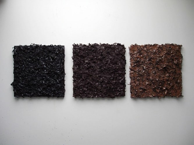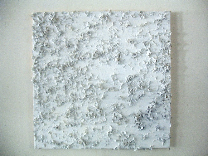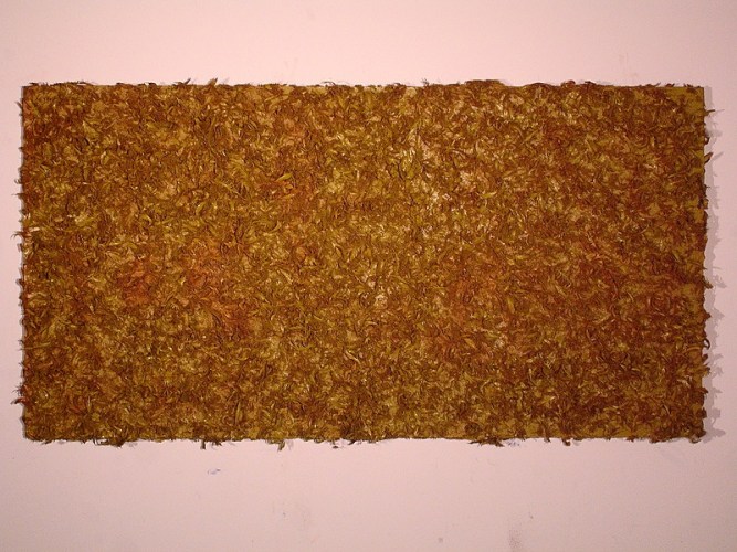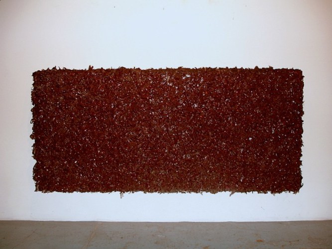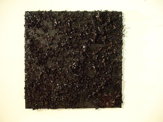 Technically, the new paintings are a little deceptive in that the viewer’s initial impression centers on the overall visual density of the work. Closer inspection reveals the variety of materials and textures. The receding depth of the feathered surfaces heightens our awareness of these densely painted surfaces. Unlike Coates’ earlier work with their impenetrable interior surfaces, here interior space appears rather open and the exterior is loaded with rich tactile quality. For the most part texture provides the lead in these new works resulting in a complex build-up and modulation of varying surface treatments created by the applications of the feathers to the wooden surfaces that accentuates the complexity of the color scheme. He has skillfully achieved a complex surface texture by partially transforming their materiality through as series of overriding rhythmic patterns that dominate the works and saturating the painted surface. The build-up of surfaces rather functions here to enhance their illusionistic effects. This approach achieves paintings that are rich and lustrous in their surface treatment, yet somewhat elusive.