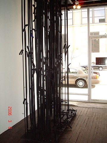 For STRUT, Coates constructed a site specific installation to work within the unique gallery space of Magnan Projects. Inspired by spatial aspects of the long narrow room, Coates plays with ideas of entry and exit, seeing the works in one way and then turning around to view them in another light, as well as the journey (strut) of experiencing the artwork. Upon entering the gallery, the viewer is met by a floor-to-ceiling black rubber “painting”, resembling bamboo. The sheer size of the piece encourages the viewer to get up close and examine his use of materials. Coates also embraces the nature of the peripheral experience; one must walk by several times to take in its entirety.