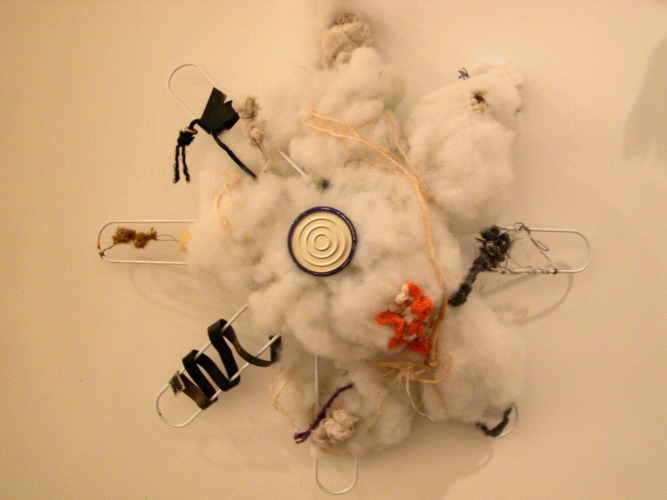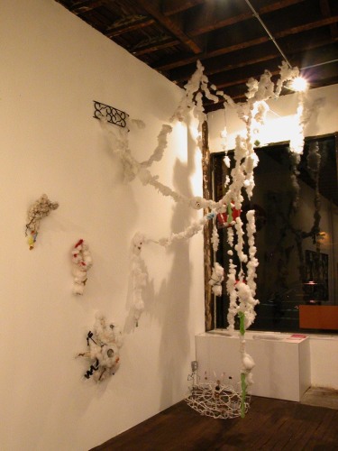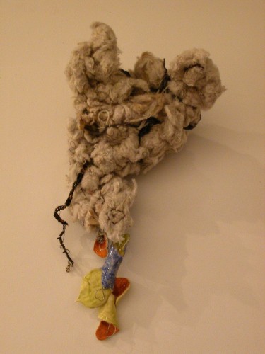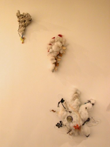 Tammie Engelhart works beyond found objects, recycling the stuffing of things. Her window installation suggests a home that has exploded, as she salvages an unrecoverable domestic skin, with no pretension of future normality.