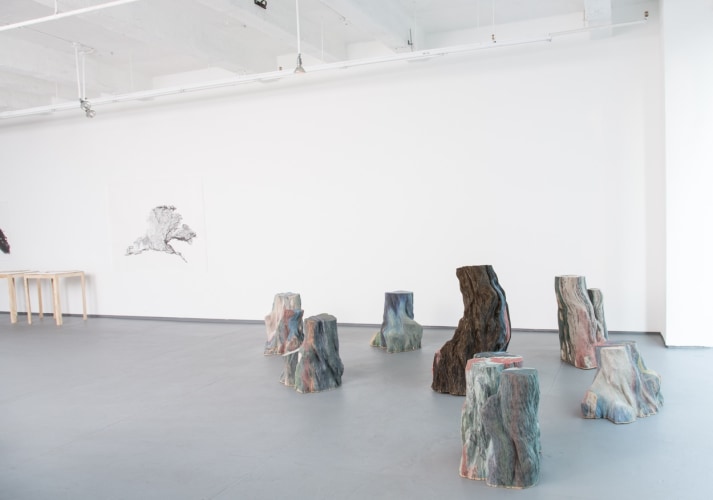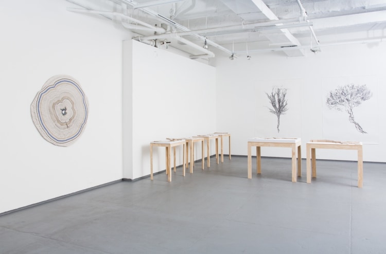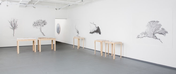 Lagos will celebrate this sacred myth, a product of oral tradition, through sculpture, paper reliefs, collage and large-scale drawings. Nestled together in the natural sunlight of the gallery window are a cluster of tree trunks, each stacked with thousands of sheets of paper and carved into sturdy, organically shaped structures. Dendritic paper reliefs, both high and low, are presented on wooden tables lining the rear of the gallery. Along the walls are rich graphite works on paper (72 x 66 in) depicting the Selenga River and Ganges Forest. Each work exhibited in The Great Tree of Water will represent Wone’s vast impact on the Amazonian landscape and the legacy it left behind.