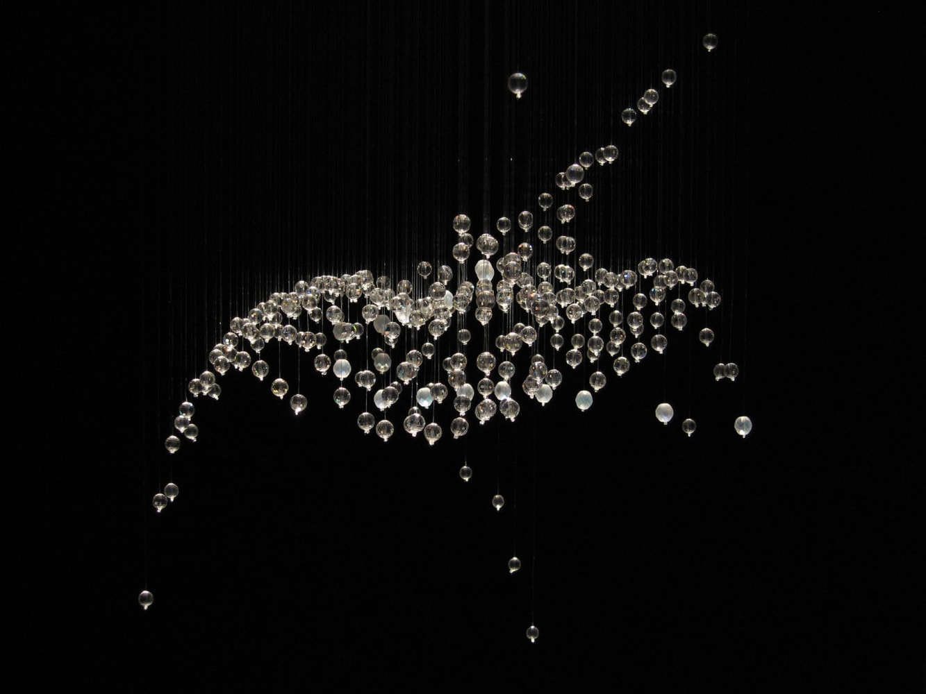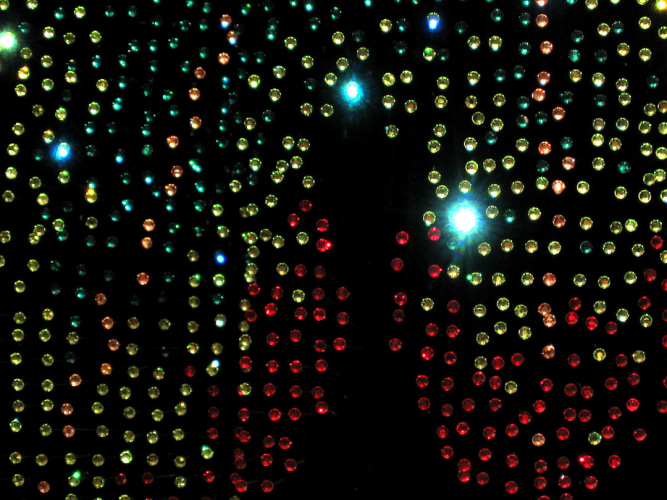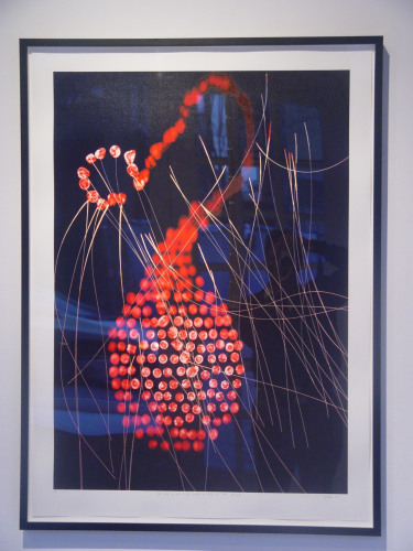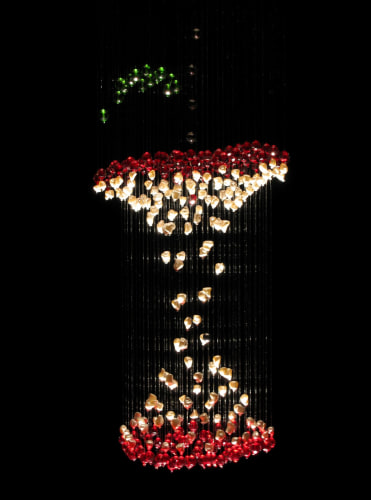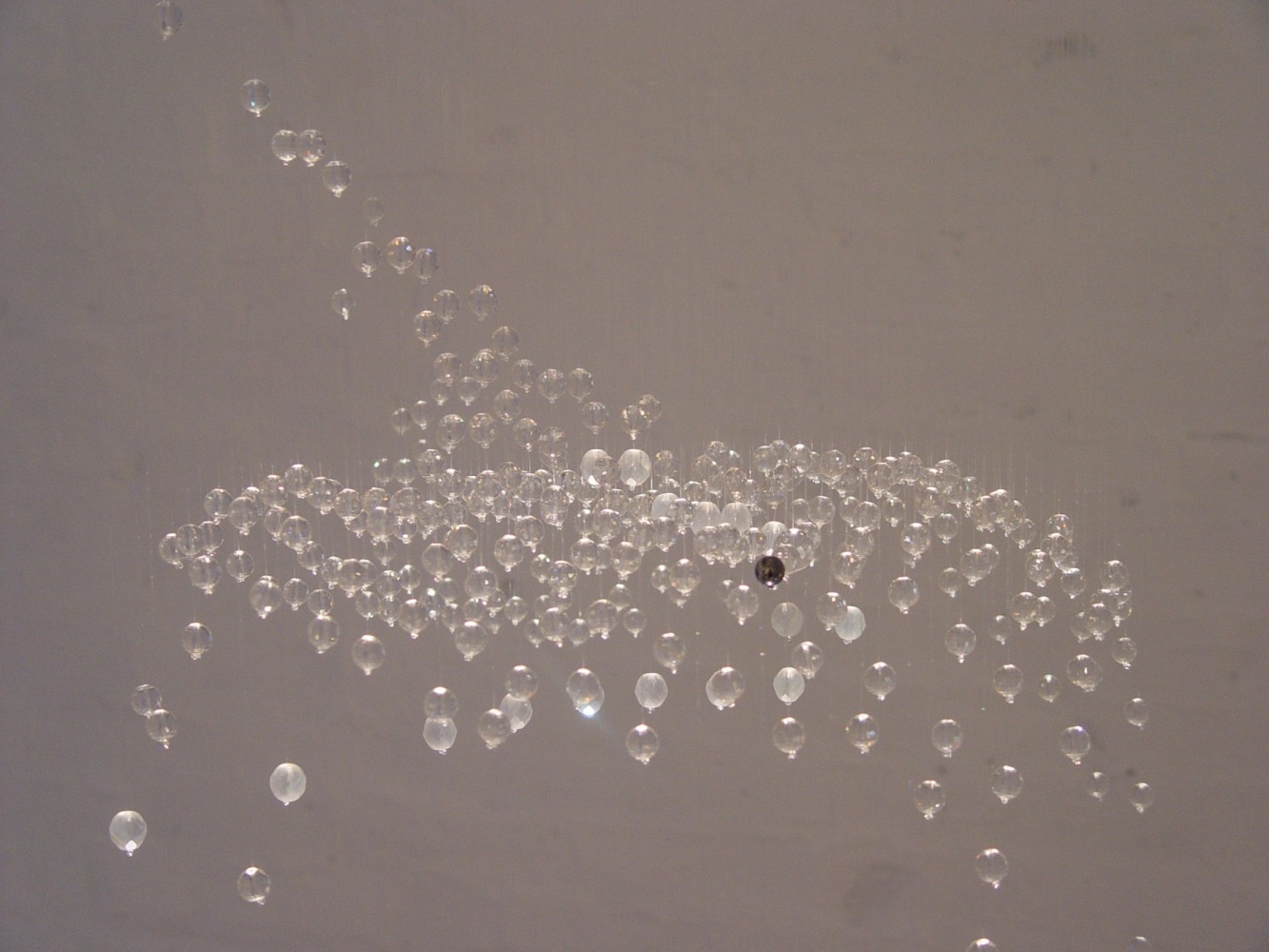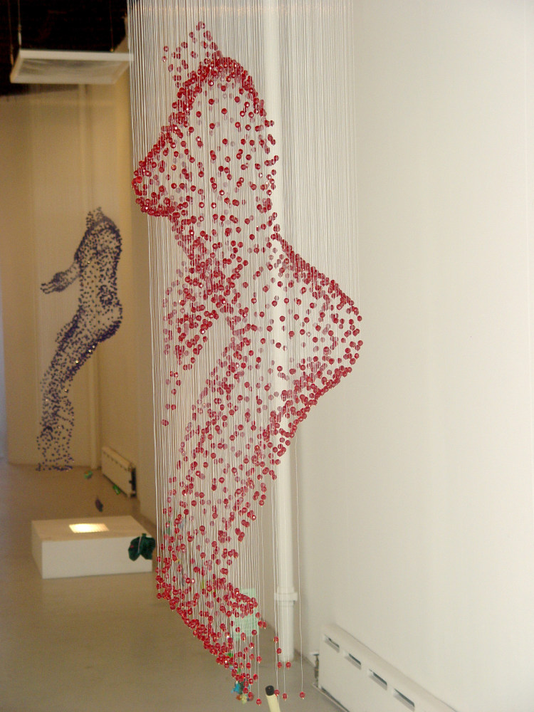 It is this materialization that one encounters upon entering Milton’s Paradise in Magnan Projects. Viewers are met by a three-dimensional life-size form of Eve (Genesis 3:16), comprised of bright red glass beads suspended from the ceiling by strands of monofilament, in the form of the female icon Marilyn Monroe. Behind her, in a nonchalant, cross-legged stance is Adam (Genesis 3:12) à la James Dean smoking a cigarette created out of blue glass beads with red beads representing Adam’s missing rib. Weaving throughout the gallery and between the two figures is a green Serpent.