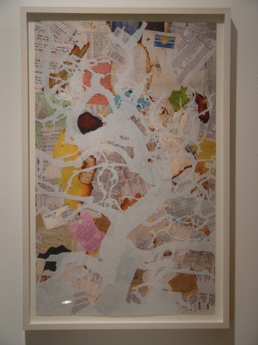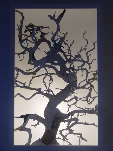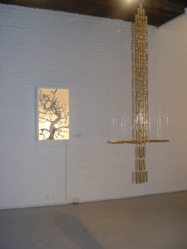 Magnan Emrich Contemporary houses Genesis 3:24 (Flaming Sword) made of the bullet casings from the war. Flanking the sword is the Tree of Knowledge of Good and Evil: a montage of pieces of papers scattered from the World Trade Center that the artist collected in Brooklyn on 9/13. Among other works included are Genesis 3:11 (the Forbidden Fruit), and Genesis 2:7 (The Breath of Life) and Adam and Eve’s Leaves – which are reversed in this case. Another theme the artist explored while creating this exhibition is that of power in all its various forms: “female power; omnipotence; the power of belief and the power of respect; the power of a moment and the power of a metaphor… The power of irony represented in the flaming sword: that of protecting life by bombing it. As well as the power of ambiguity represented in the two leaves where sex and gender are flipped.”