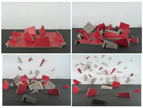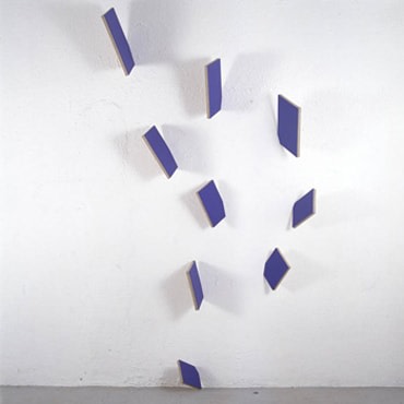 The initial impression of the installation is one of color and shape. This impression will segue as the viewer moves through the installation until the piece is seen from the back of the gallery, where the unpainted backside of the fragmented “slices” of canvas reveals an entirely different perspective.