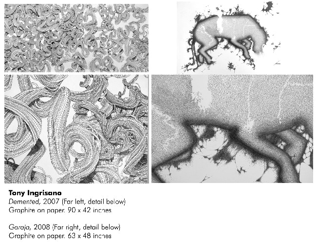 Tony Ingrisano: Is concerned with creating a unique language through which one may find new ways of communicating. This language uses an ever-increasing vocabulary that offers a unique lens through which to view the world we live in. I seek to expand the accepted modes of exchange, allowing new methods to disseminate, translate, and transfer information. One primary concern of the drawings is that of addressing the increasing incongruities in the ways humans look at, deal with, and exist within our surroundings. The line between what is and should remain natural, and what aspects of our world we inject technology and bioengineering into blurs further every minute. Within this connection humans have discovered myriad beneficial opportunities, but with this must come the responsibility of questioning what actions are within moral boundaries with concern to not only protecting our environment but symbiotically co-existing within a world which we depend on for survival.