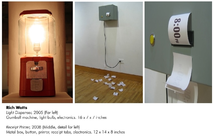 Rich Watts: I construct simple forms with complex functions and complex forms that perform simple tasks. Everything I produce is an experiment. Many of my ideas are conceived with nonsense and absurdity as points of departure, and often arrive at novel ways of imparting information. This information is sometimes practical and sometimes not, but often means something to somebody on some level. I delight in presenting objects that engage a person's child-like tendencies - to take pleasure in touching, hearing, and experiencing. My work is guided equally by intuition and technical practicality. I am fascinated by intrigues that appear at first superficial, but later reveal significant undercurrents in popular interest. I delight in mediocre and mundane tasks given significance through their automation, and I aspire to devise tools and signs that reveal something unexpected about their user.