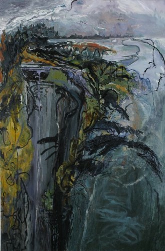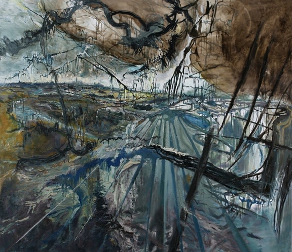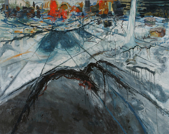 Hard Rain (oil on canvas,  90 x 78”), based on drawings the artist made while traveling in New Jersey looking back over the marshlands to distant Manhattan, creates a sense of anxiousness and flight through its vertiginous movements. Heller’s paintings are a direct response to her observations of ordinary urban spaces and their ability to possess an unsettling and violent mood.  She asks, “Isn’t it eerie how an every day city view can suddenly turn sad or ominous?”  Intentionally heavy and hard to look at, the viewer is none-the-less drawn in to its beautiful gloom.