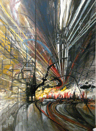 Heller’s newest works focus on Greater New York. Her skyscraping vision of the city is like a turbulent map of emotionally charged memories. A restless painterly energy invites the viewer into a psychic world that reproduces The City as the center of daily life.  Art critic Eric Gelber observes, “She captures the energy of the roving gaze, the feeling we experience as our gaze travels great distances and traces forms, as if our eyes were drawing implements… Her expressive lines compress, elongate and blend actual spaces that are transformed by her imagination.”